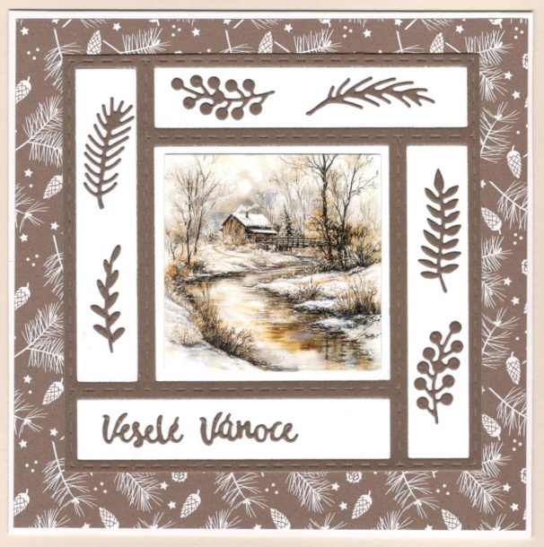 Při tvorbě přáníčka byl použit obrázek z papíru 31×32 cm Zimní pohádka, krajina v sépiové I., vyřezávací šablona Skládaný rámeček, různé vyřezávací šablony větviček.