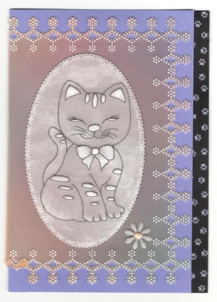 Přáníčko technikou papírová krajka vyrobila Milaask. Tentokrát přáníčko ozdobila namalovanou kočkou a prostřihovaným okrajem. Je nádherné, moc děkujeme.